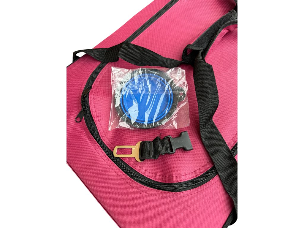 Součástí balení je i bezpečnostní pás do auta a skládací miska.
