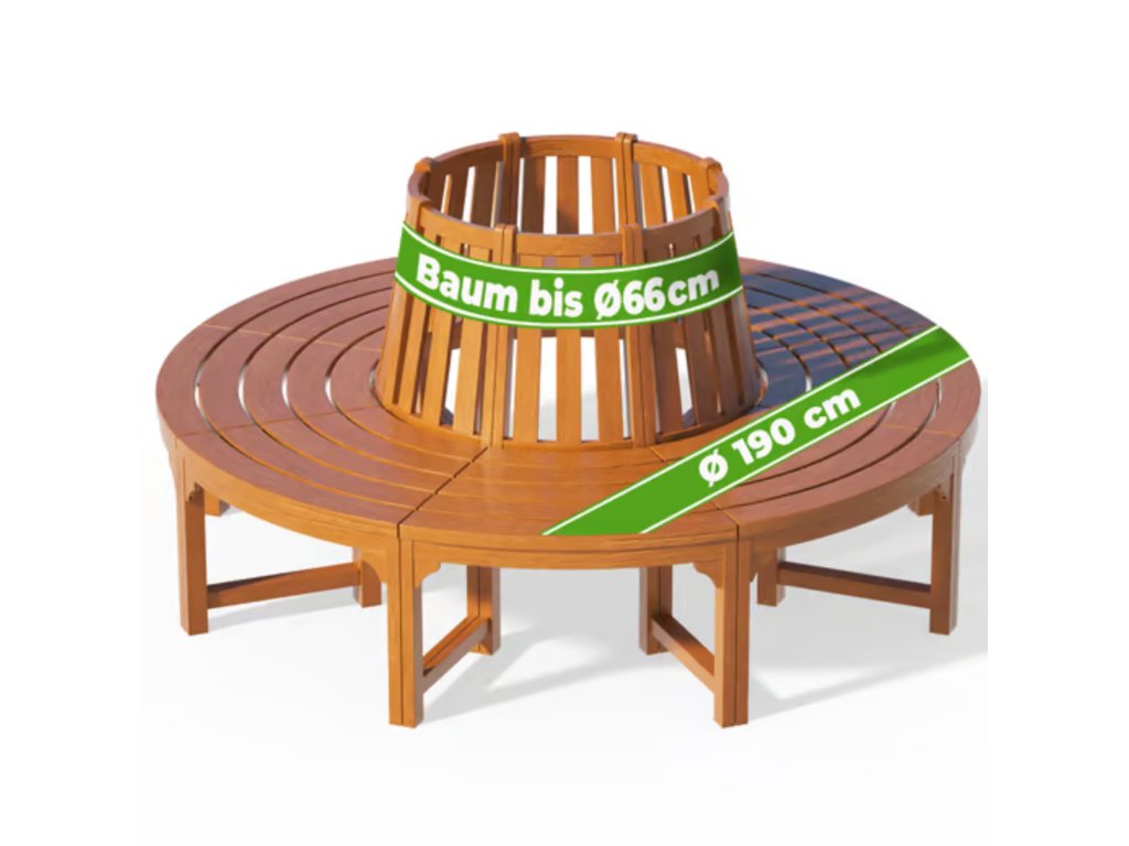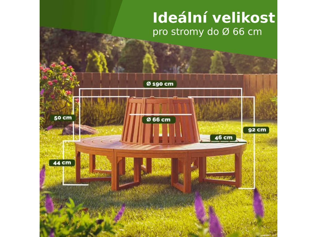 Díky průměru 190 cm poskytuje lavička dostatek prostoru pro více osob a umožňuje vytvořit výrazný zahradní prvek kolem stromu, keře nebo dekorace.