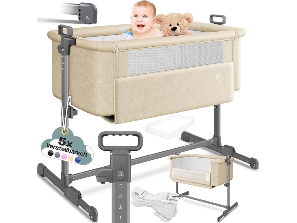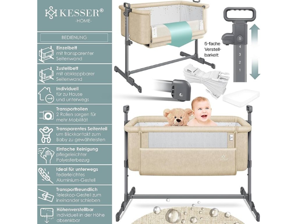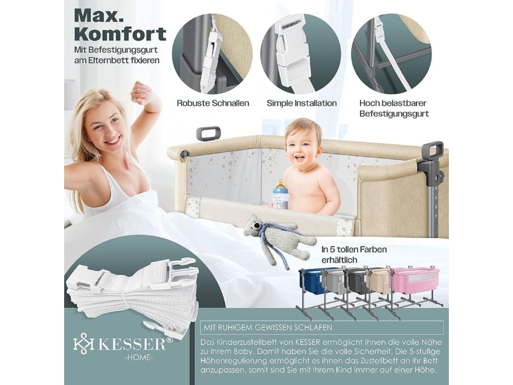 Praktická 3-v-1 dětská postýlka KESSER Hubi 🌙✨ – můžeš ji používat jako přistavnou postýlku k posteli rodičů, samostatné dětské lůžko nebo pohodlnou cestovní postýlku.