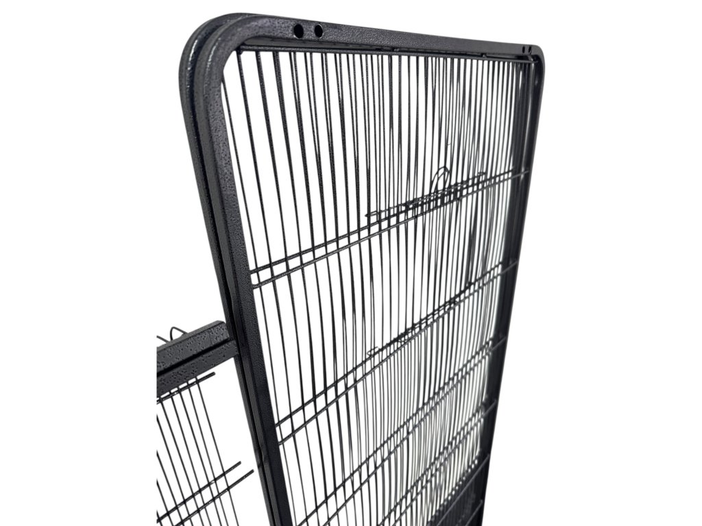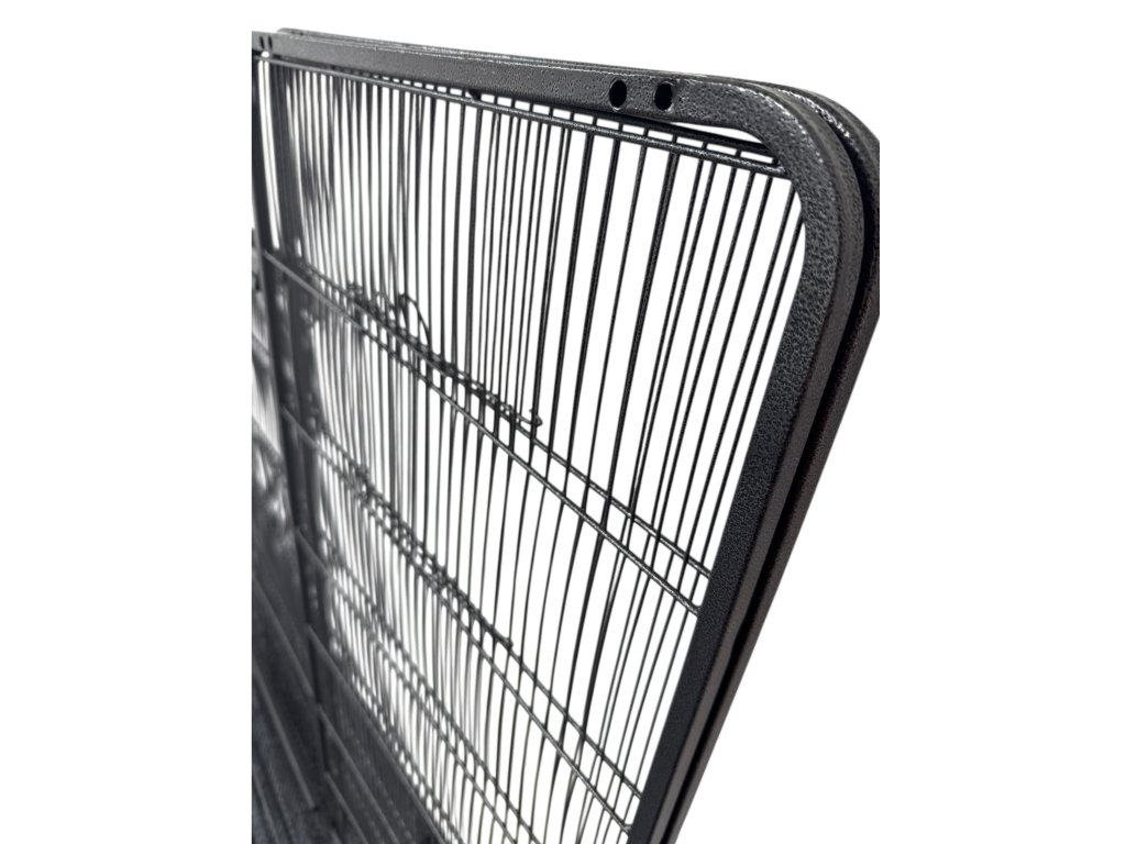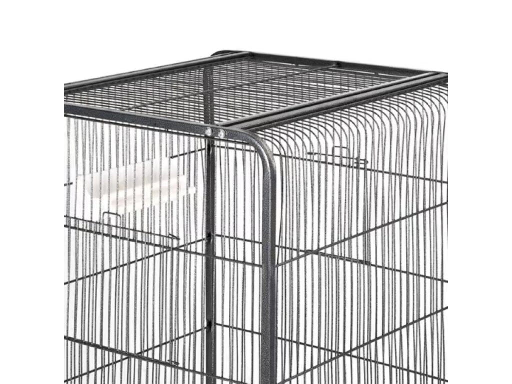 Robustní celokovová konstrukce s jemným mřížováním, dvěmi prostornými dvířky, čtyřmi dřevěnými bidýlky a praktickou výsuvnou pískovou zásuvkou pro snadné čištění. 📦