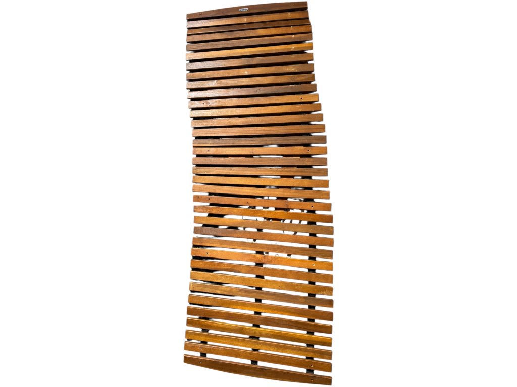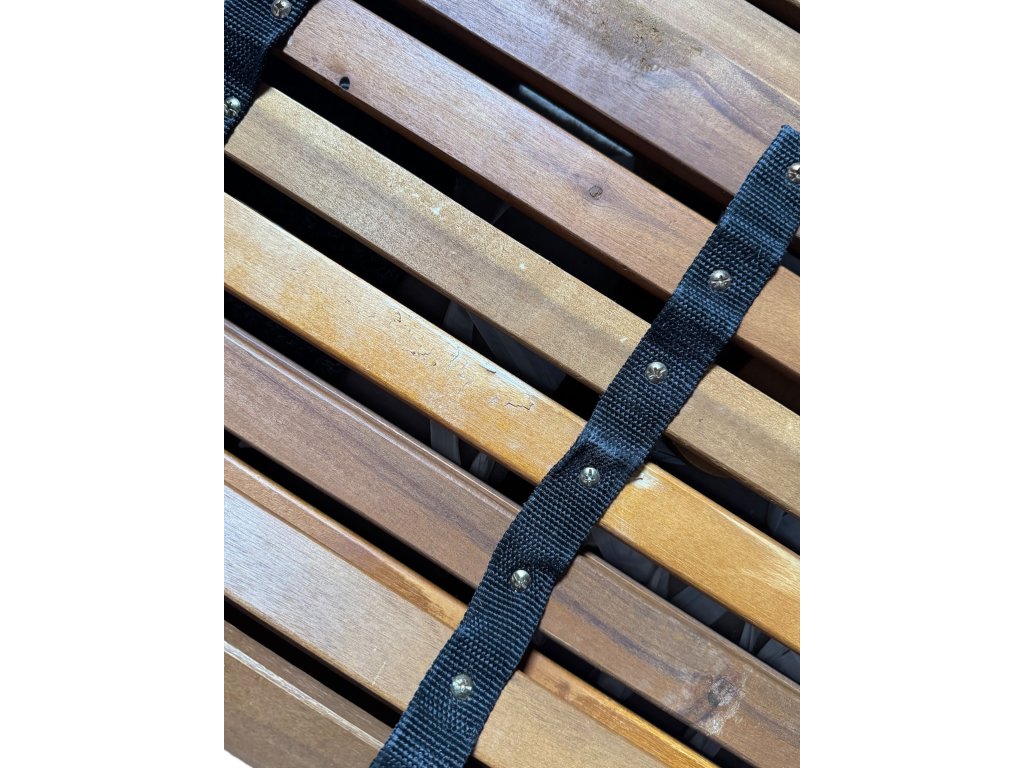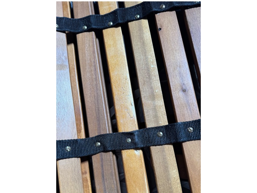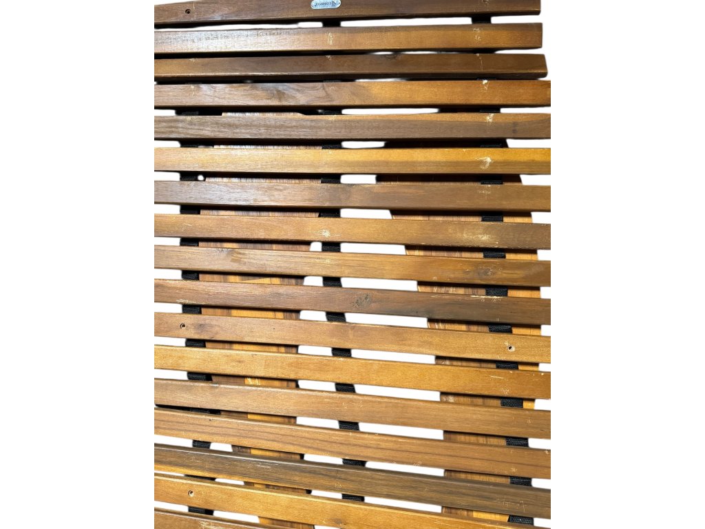 Produkt je rozbalený, nepoužitý, ale díky špatnému balení došlo k poškrábání dílů a jedna lamela je zespodu povrchově uštíplá. Všechny díly jsou rozložené a lehátko je dodáváno v originální krabici.